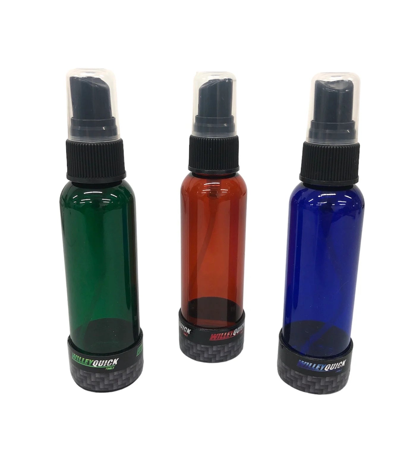 Magnetische Sprühflasche mit Carbonfaser-Optik, erhältlich in Grün, Rot und Blau.